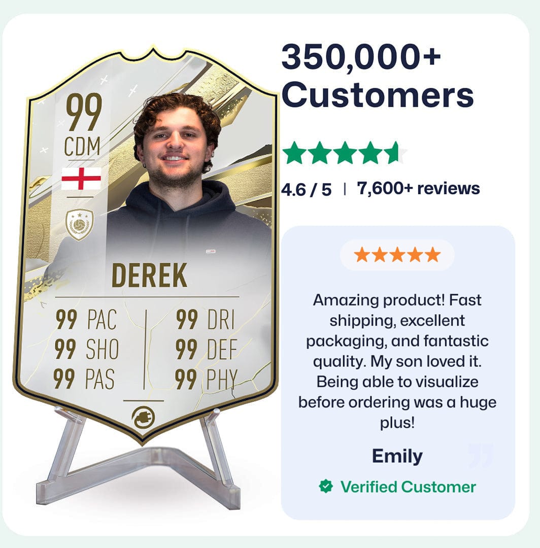 Yes! Our football card designers will remove the background from the photo you upload so it looks just like the football cards you might’ve seen games like EA FC 25, EA FC 24 or FIFA. We’ll also position the photo perfectly on the football card so it looks great. If there are any problems with the quality of your photo, we’ll reach out and let you know. Plus, our website's AI will remove the background on the image for visual purposes before purchase so you can see it without a background on the card.