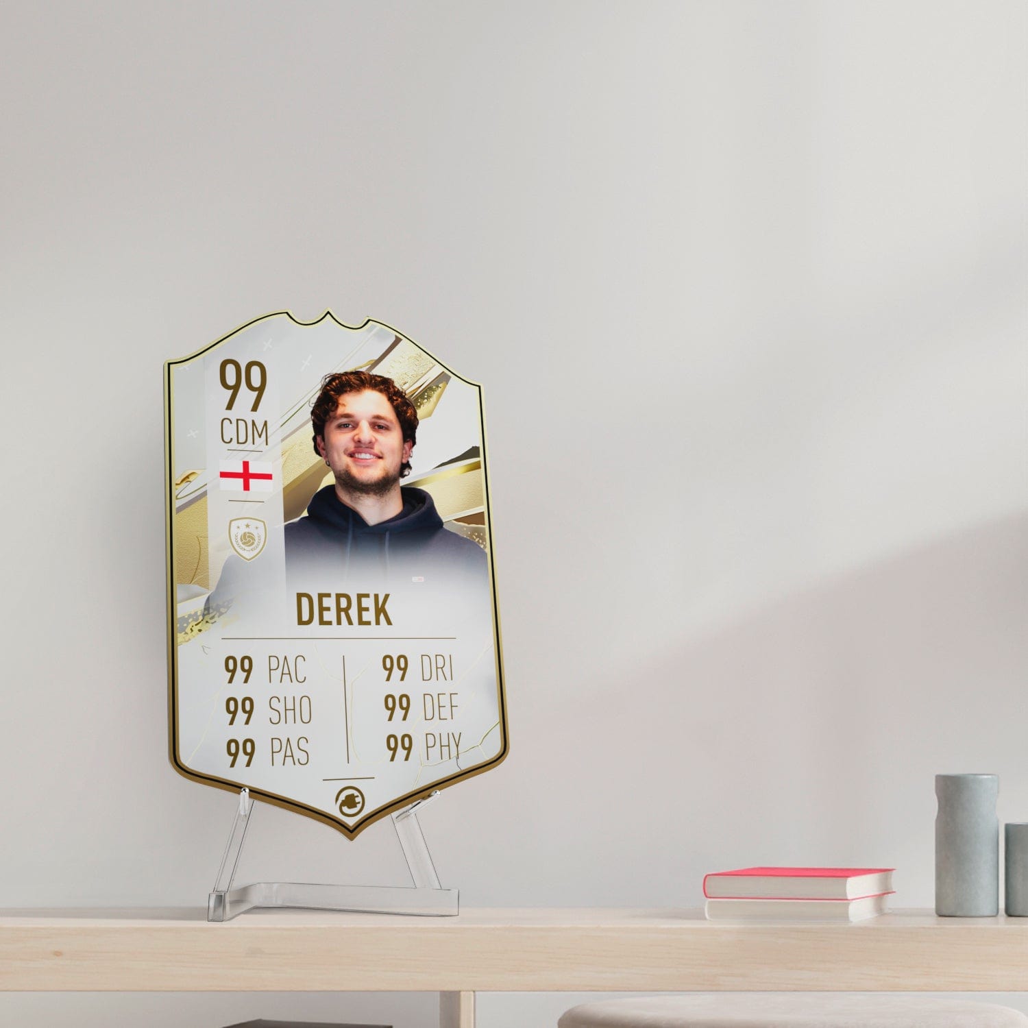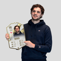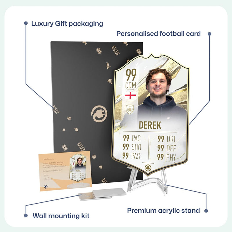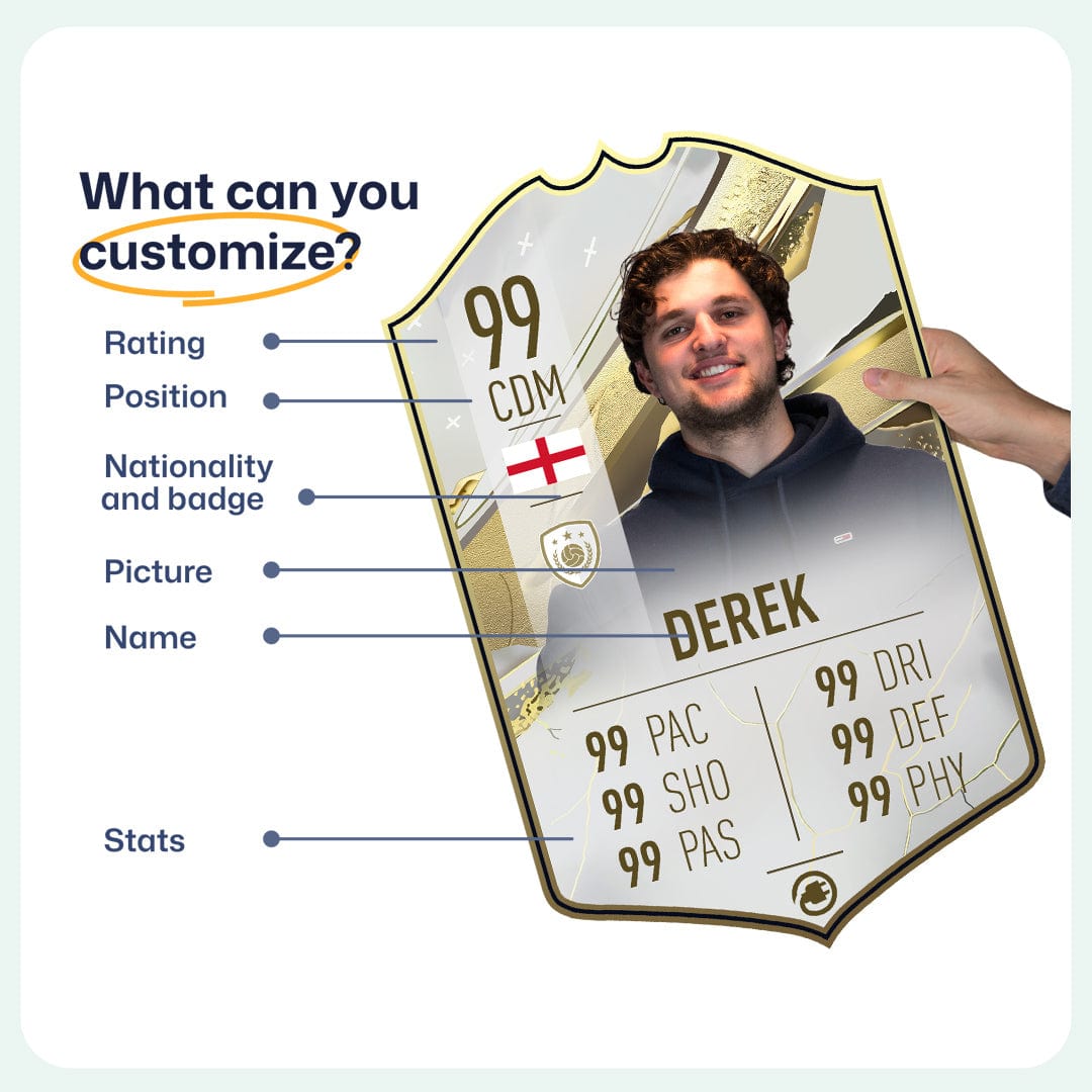 When it comes to personalising your card, the basic steps are to upload a photo and add a name to your card. Then you’ll add details like your player’s position and skill ratings out of 99 for each football skill shown on the card. Our online card builder makes this really easy. And if you aren’t a football card expert, don’t worry!