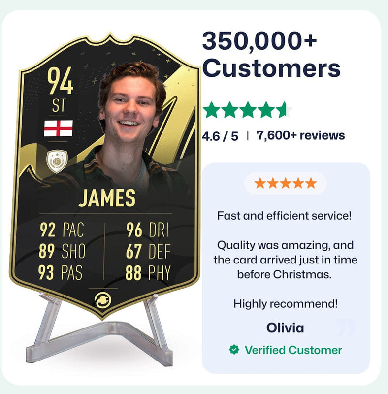Yes! Our football card designers will remove the background from the photo you upload so it looks just like the football cards you might’ve seen games like EA FC 25, EA FC 24 or FIFA. We’ll also position the photo perfectly on the football card so it looks great. If there are any problems with the quality of your photo, we’ll reach out and let you know. Plus, our website's AI will remove the background on the image for visual purposes before purchase so you can see it without a background on the card.