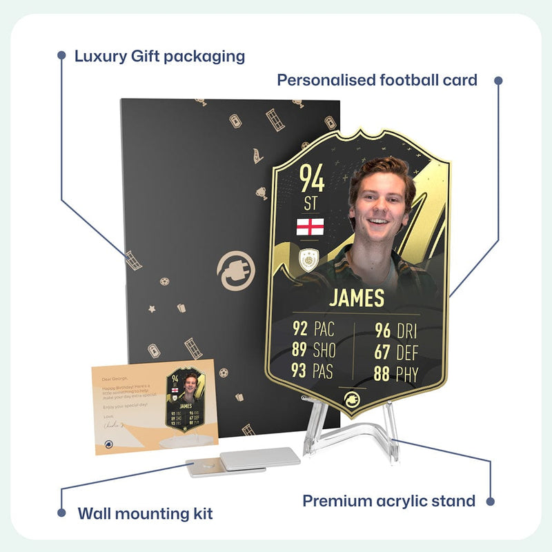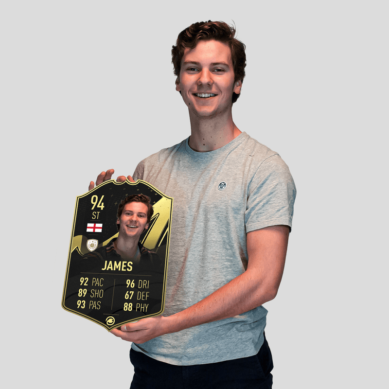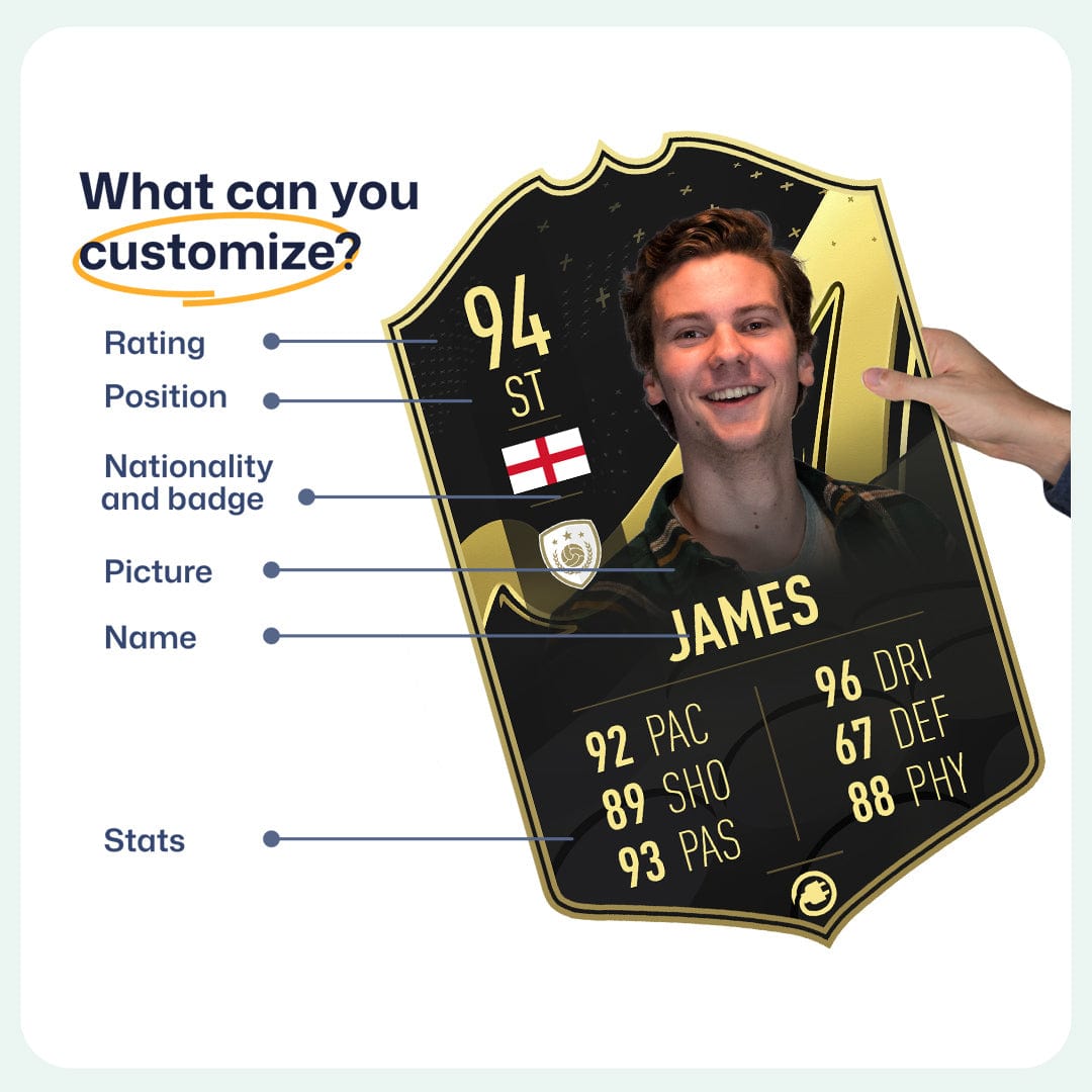When it comes to personalising your card, the basic steps are to upload a photo and add a name to your card. Then you’ll add details like your player’s position and skill ratings out of 99 for each football skill shown on the card. Our online card builder makes this really easy. And if you aren’t a football card expert, don’t worry!