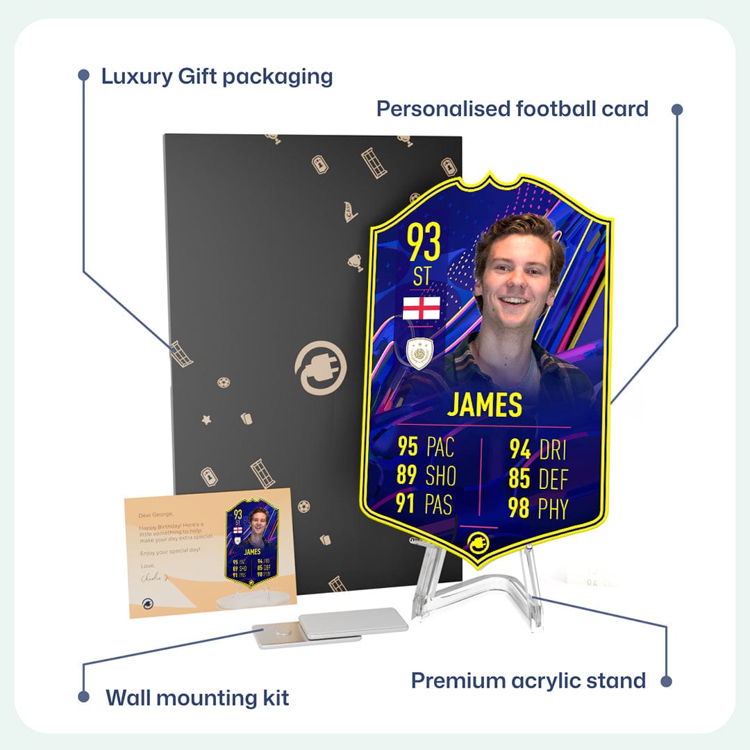 When it comes to personalising your card, the basic steps are to upload a photo and add a name to your card. Then you’ll add details like your player’s position and skill ratings out of 99 for each football skill shown on the card. Our online card builder makes this really easy. And if you aren’t a football card expert, don’t worry!