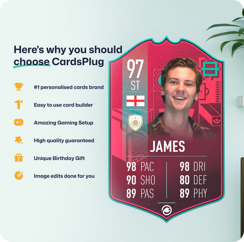 When it comes to personalising your card, the basic steps are to upload a photo and add a name to your card. Then you’ll add details like your player’s position and skill ratings out of 99 for each football skill shown on the card. Our online card builder makes this really easy. And if you aren’t a football card expert, don’t worry!
