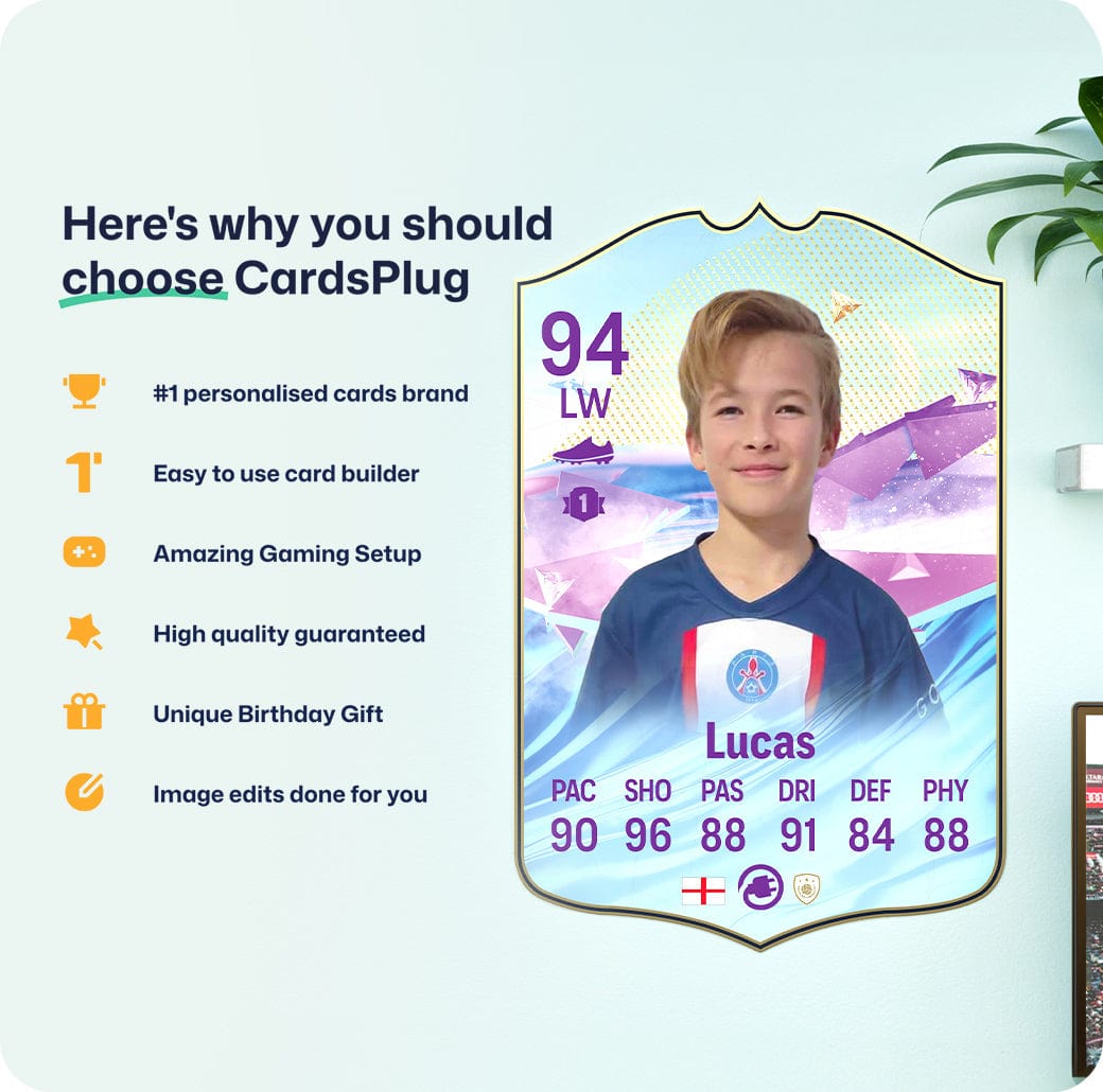 CardsPlug is home to the world’s favourite personalised football cards. Our easy football card builder lets you make a real life football card with your own name, photo, and skill ratings. With 100+ designs to choose from and some inspired by EA SPORTS FC 26 cards seen in EA FC 26, EA FC 25 and FC 24 as well as FIFA cards seen in games like FIFA 23 and FIFA 22.