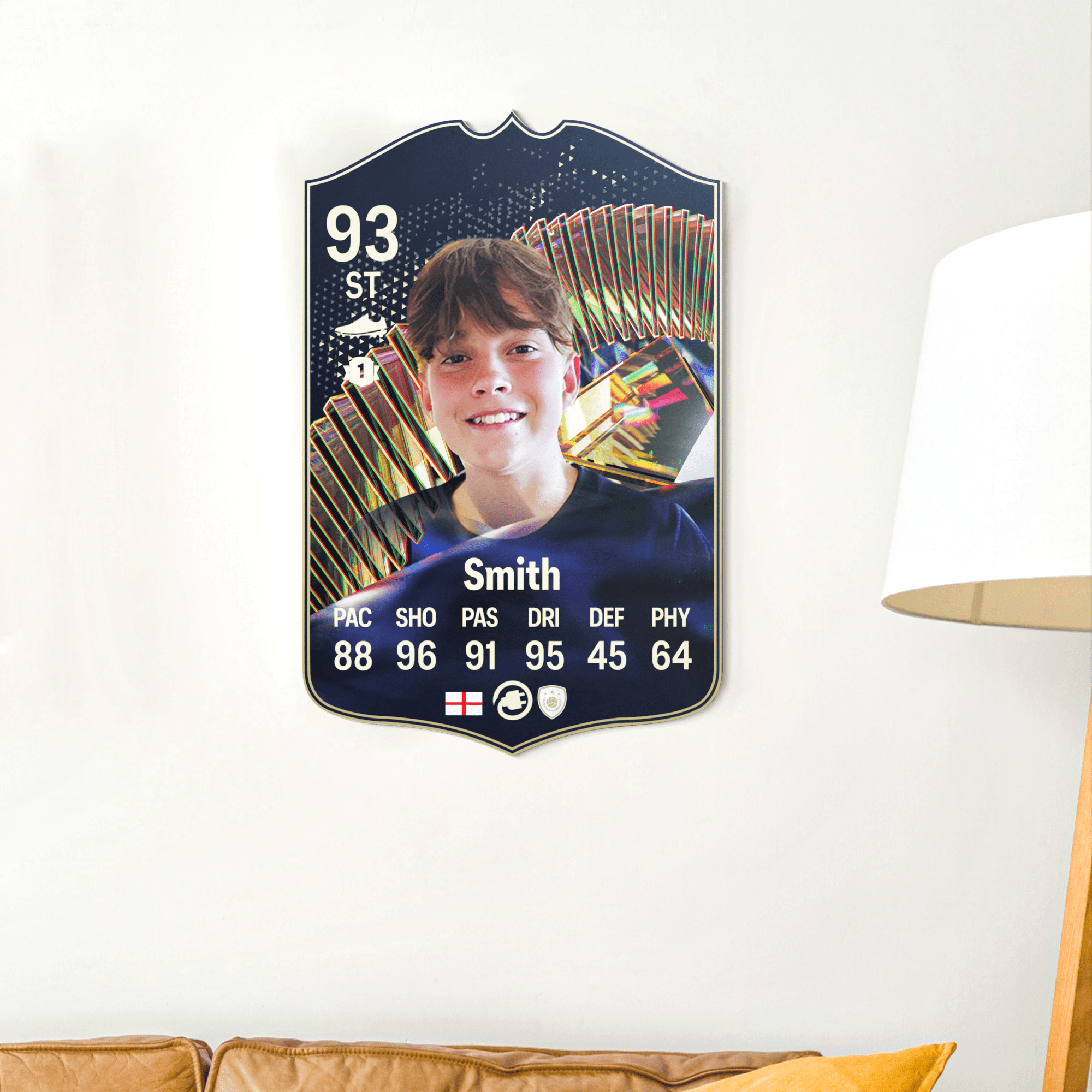 When it comes to personalising your card, the basic steps are to upload a photo and add a name to your card. Then you’ll add details like your player’s position and skill ratings out of 99 for each football skill shown on the card. Our online card builder makes this really easy. And if you aren’t a football card expert, don’t worry!