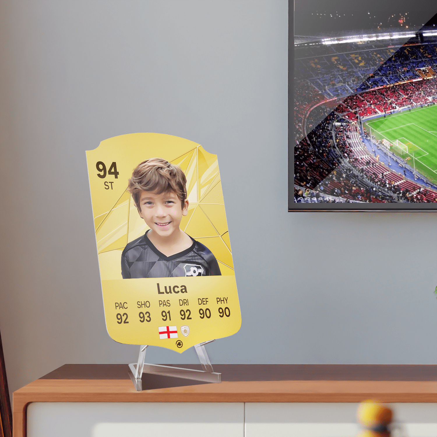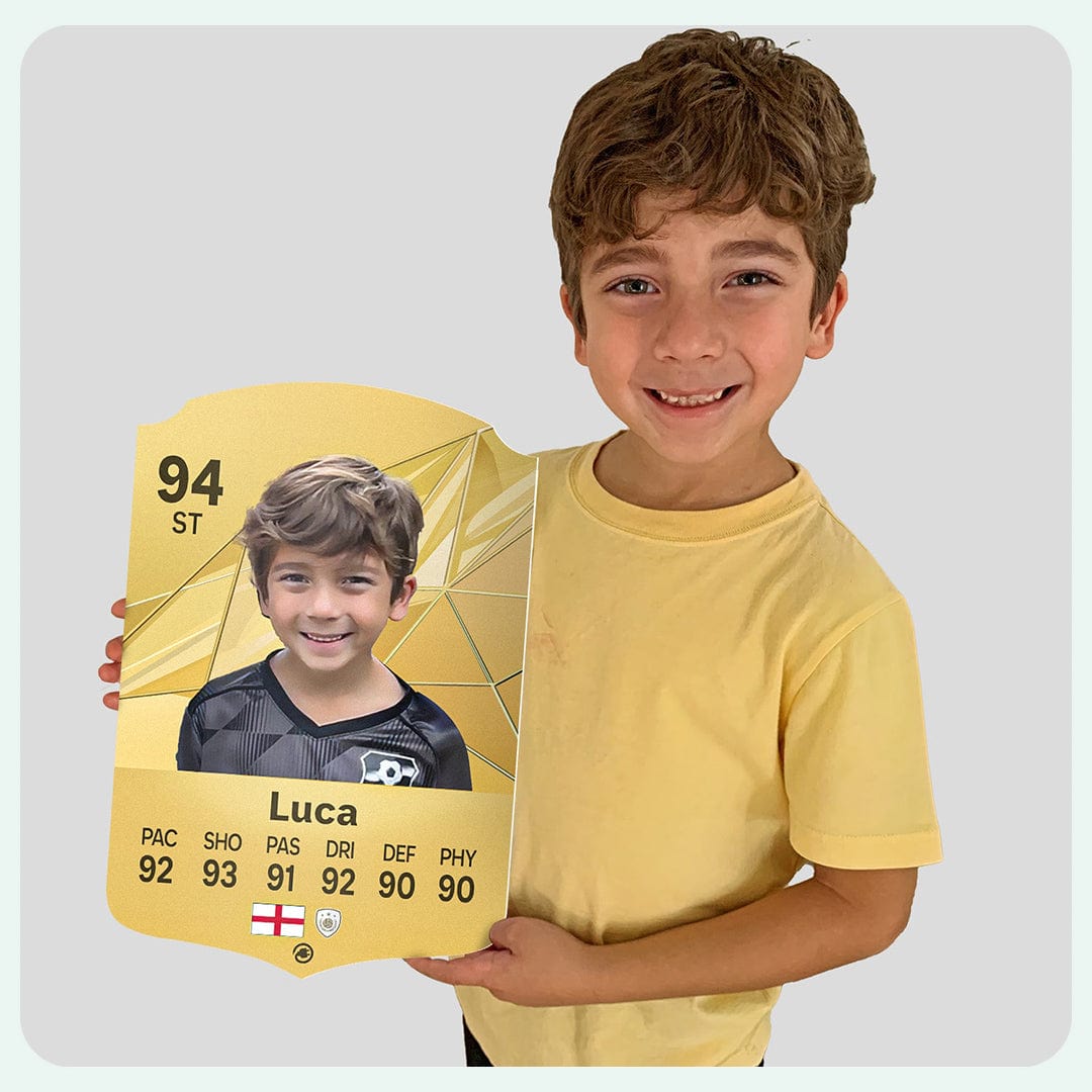 When it comes to personalising your card, the basic steps are to upload a photo and add a name to your card. Then you’ll add details like your player’s position and skill ratings out of 99 for each football skill shown on the card. Our online card builder makes this really easy. And if you aren’t a football card expert, don’t worry!