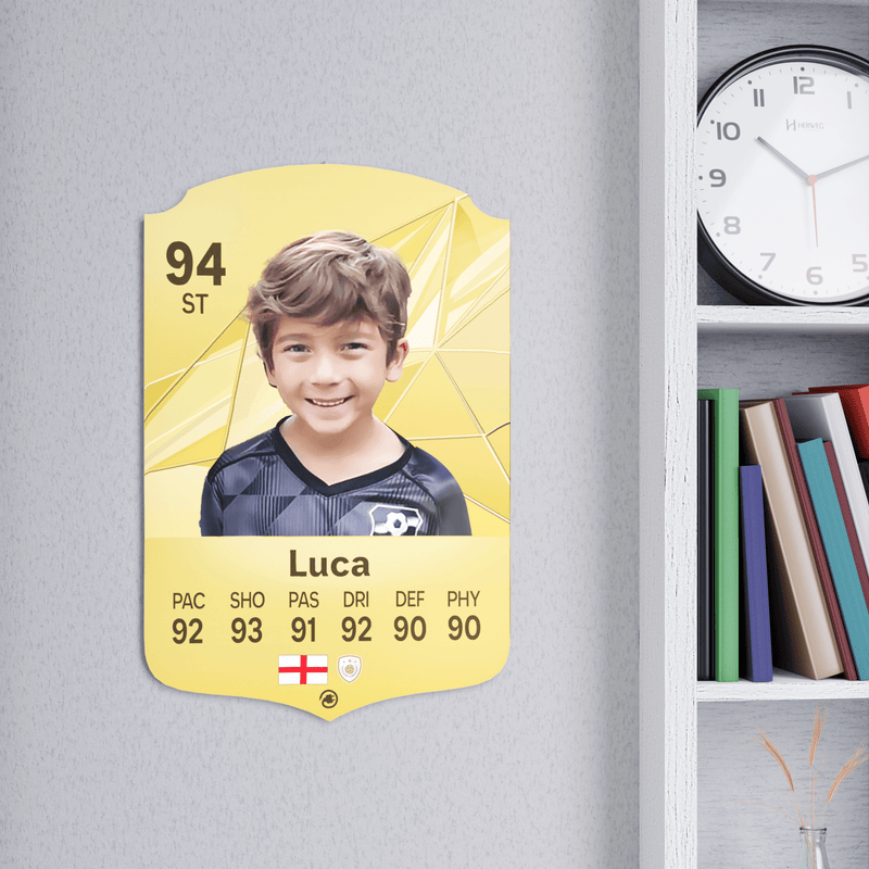 Our football card builder lets you choose between two different card materials. Our Standard cards are made of a ultra-strong variety of Foamex (not cardboard or foam!). This material has a lovely gloss finish and is also super durable. Our world-exclusive Metal football cards have a matte finish and are slightly heavier. Both look amazing and will last forever.