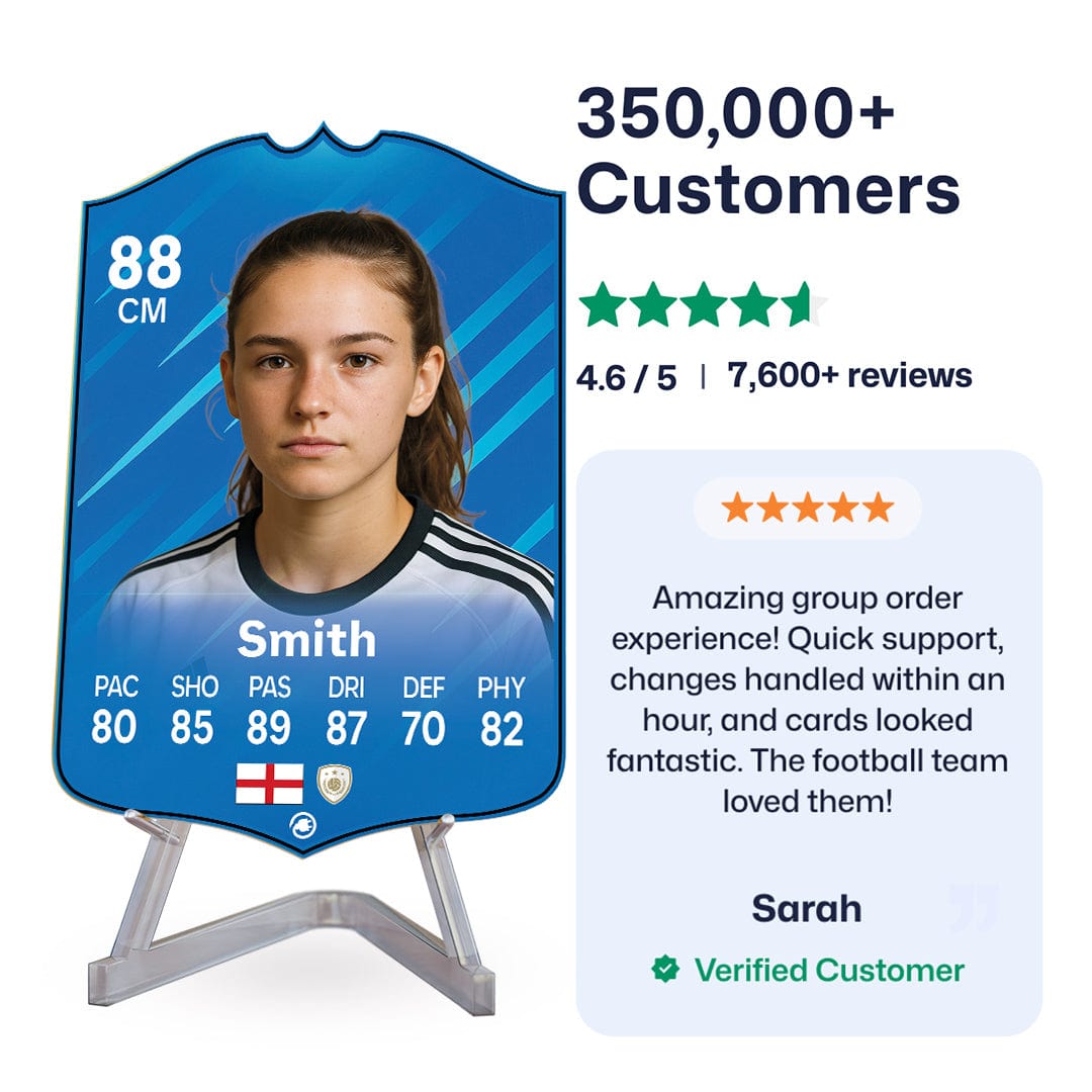 Yes! Our football card designers will remove the background from the photo you upload so it looks just like the football cards you might’ve seen games like EA FC 25, EA FC 24 or FIFA. We’ll also position the photo perfectly on the football card so it looks great. If there are any problems with the quality of your photo, we’ll reach out and let you know. Plus, our website's AI will remove the background on the image for visual purposes before purchase so you can see it without a background on the card.