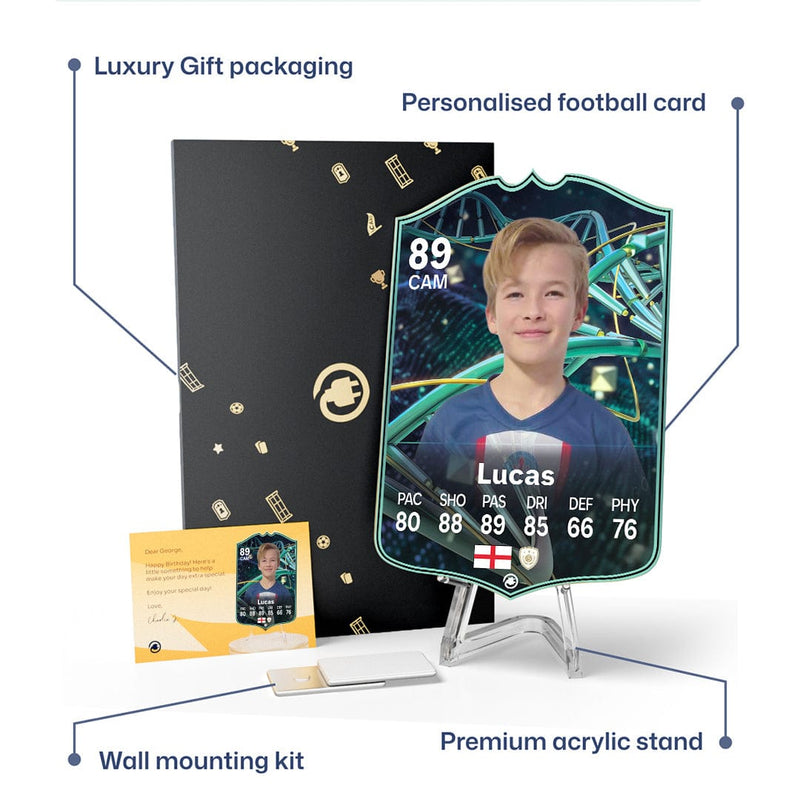 CardsPlug is home to the world’s favourite personalised football cards. Our easy football card builder lets you make a real life football card with your own name, photo, and skill ratings. With 100+ designs to choose from and some inspired by EA SPORTS FC 26 cards seen in EA FC 26, EA FC 25 and FC 24 as well as FIFA cards seen in games like FIFA 23 and FIFA 22.