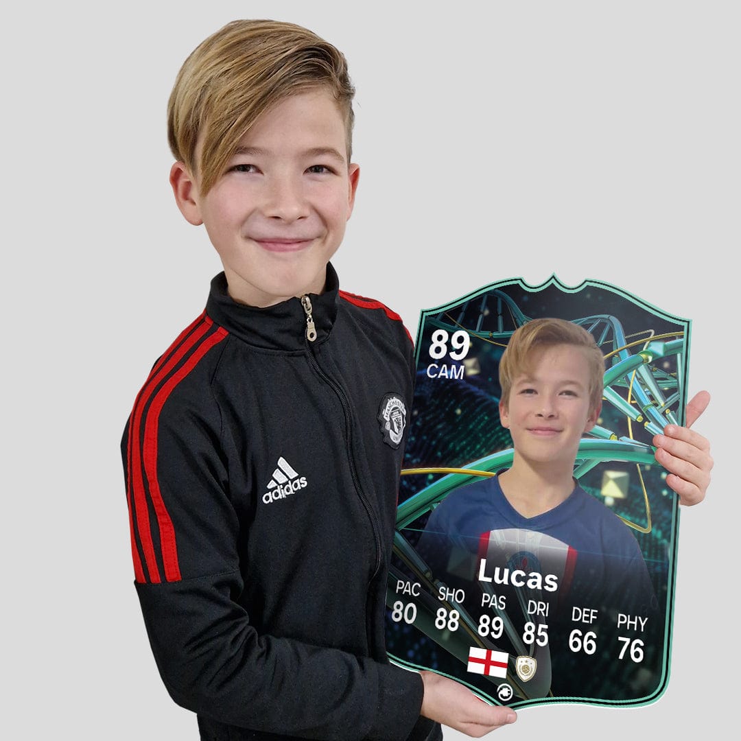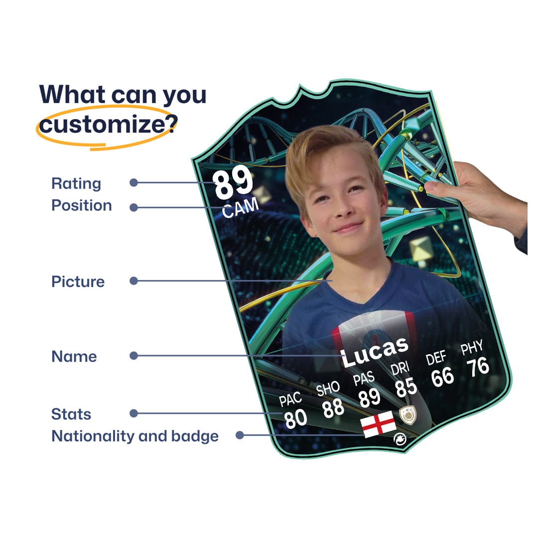 When it comes to personalising your card, the basic steps are to upload a photo and add a name to your card. Then you’ll add details like your player’s position and skill ratings out of 99 for each football skill shown on the card. Our online card builder makes this really easy. And if you aren’t a football card expert, don’t worry!