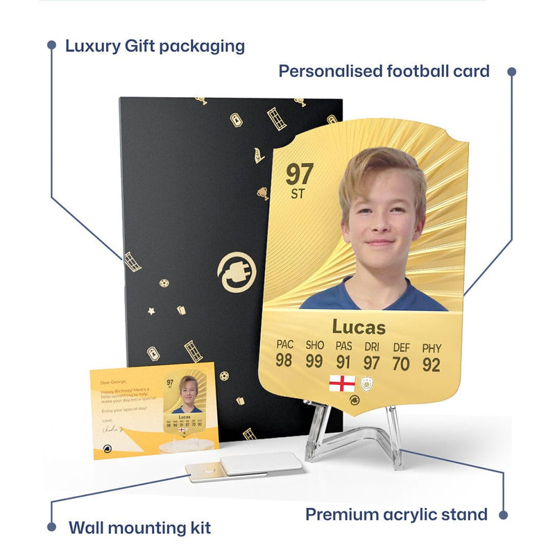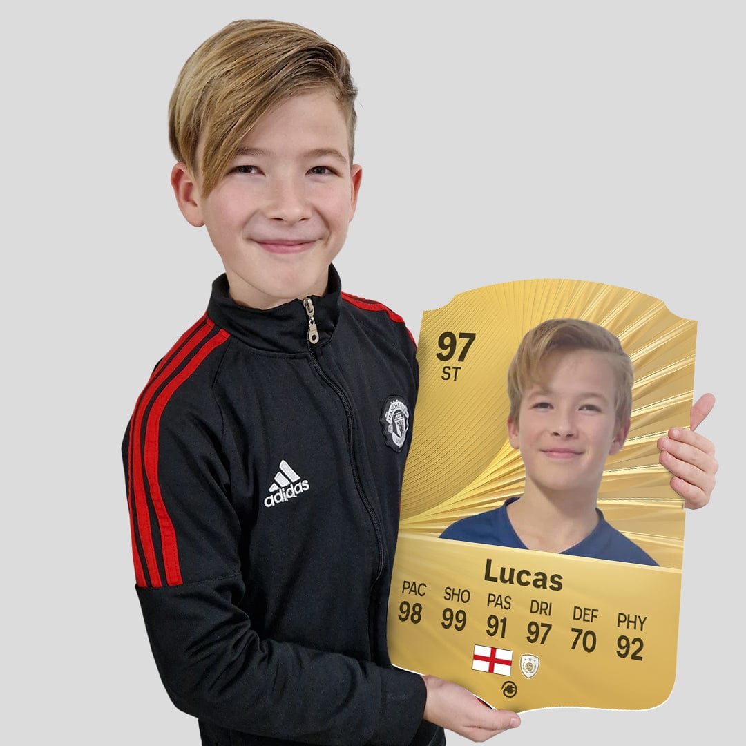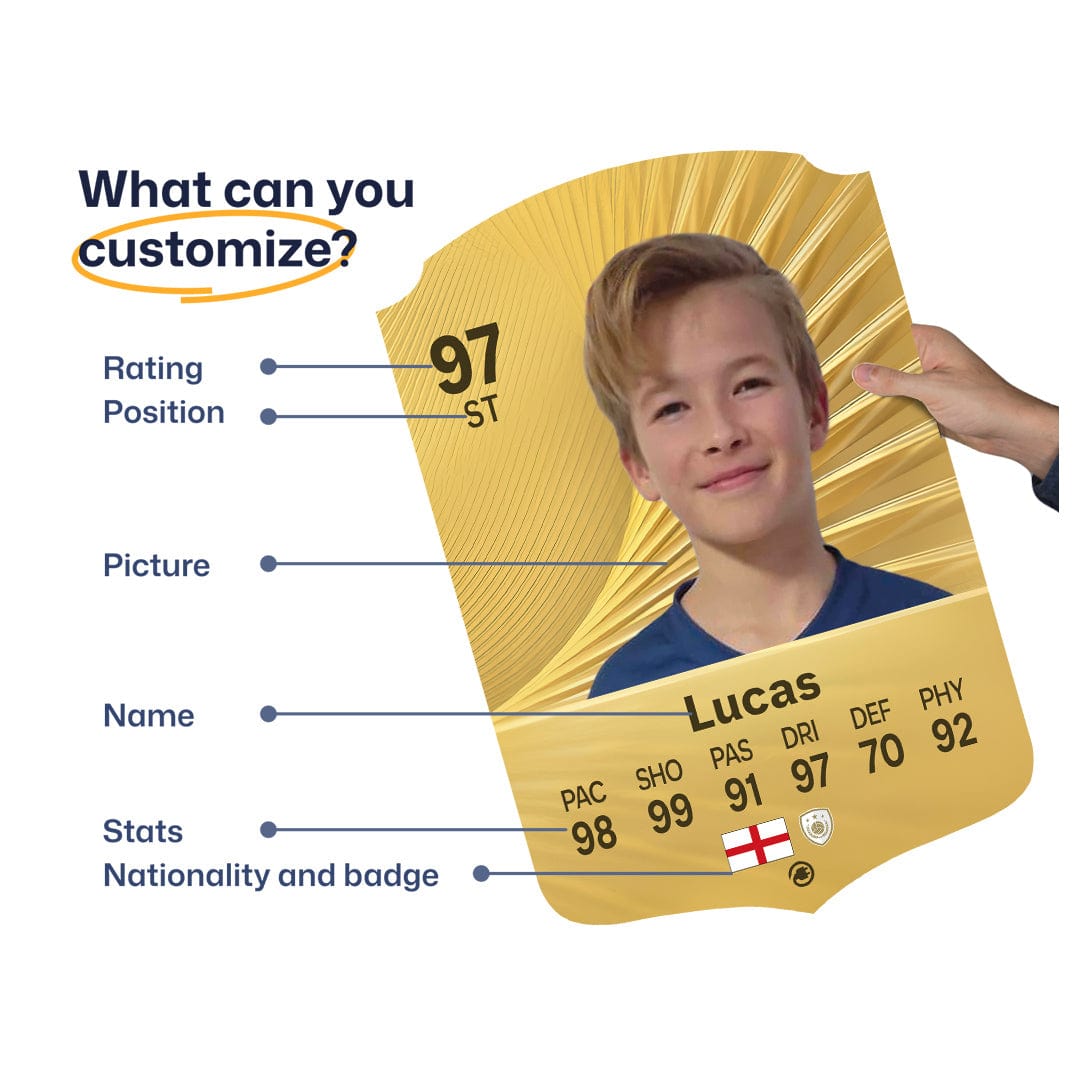 When it comes to personalising your card, the basic steps are to upload a photo and add a name to your card. Then you’ll add details like your player’s position and skill ratings out of 99 for each football skill shown on the card. Our online card builder makes this really easy. And if you aren’t a football card expert, don’t worry!