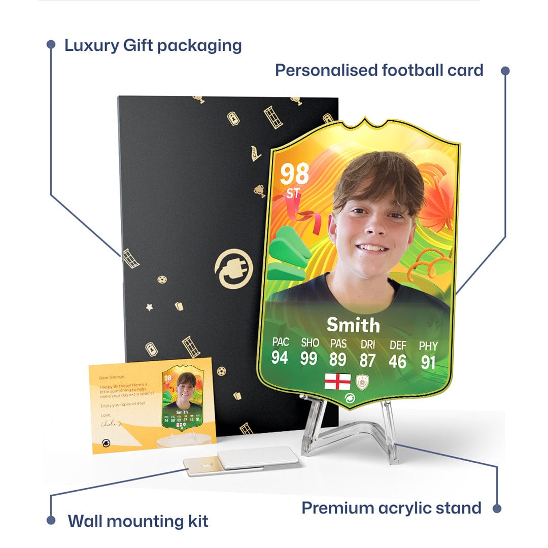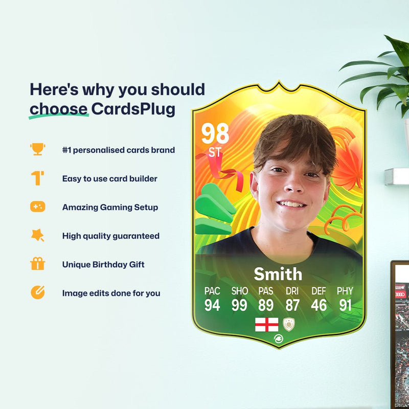 CardsPlug is home to the world’s favourite personalised football cards. Our easy football card builder lets you make a real life football card with your own name, photo, and skill ratings. With 100+ designs to choose from and some inspired by EA SPORTS FC 26 cards seen in EA FC 26, EA FC 25 and FC 24 as well as FIFA cards seen in games like FIFA 23 and FIFA 22.