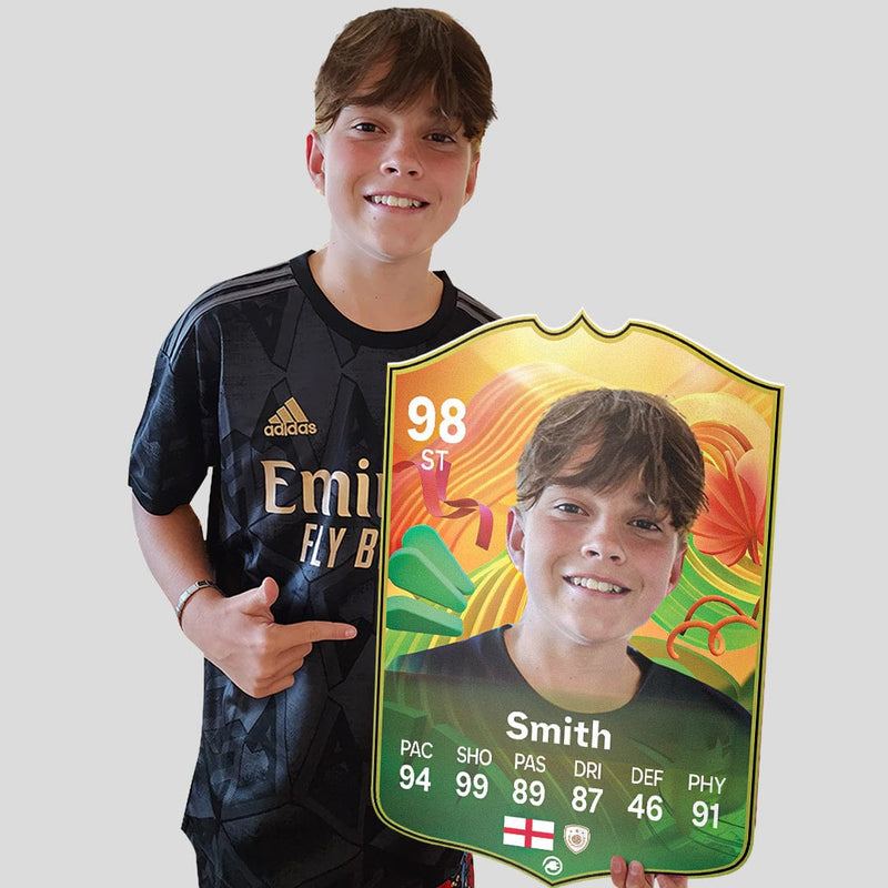 When it comes to personalising your card, the basic steps are to upload a photo and add a name to your card. Then you’ll add details like your player’s position and skill ratings out of 99 for each football skill shown on the card. Our online card builder makes this really easy. And if you aren’t a football card expert, don’t worry!