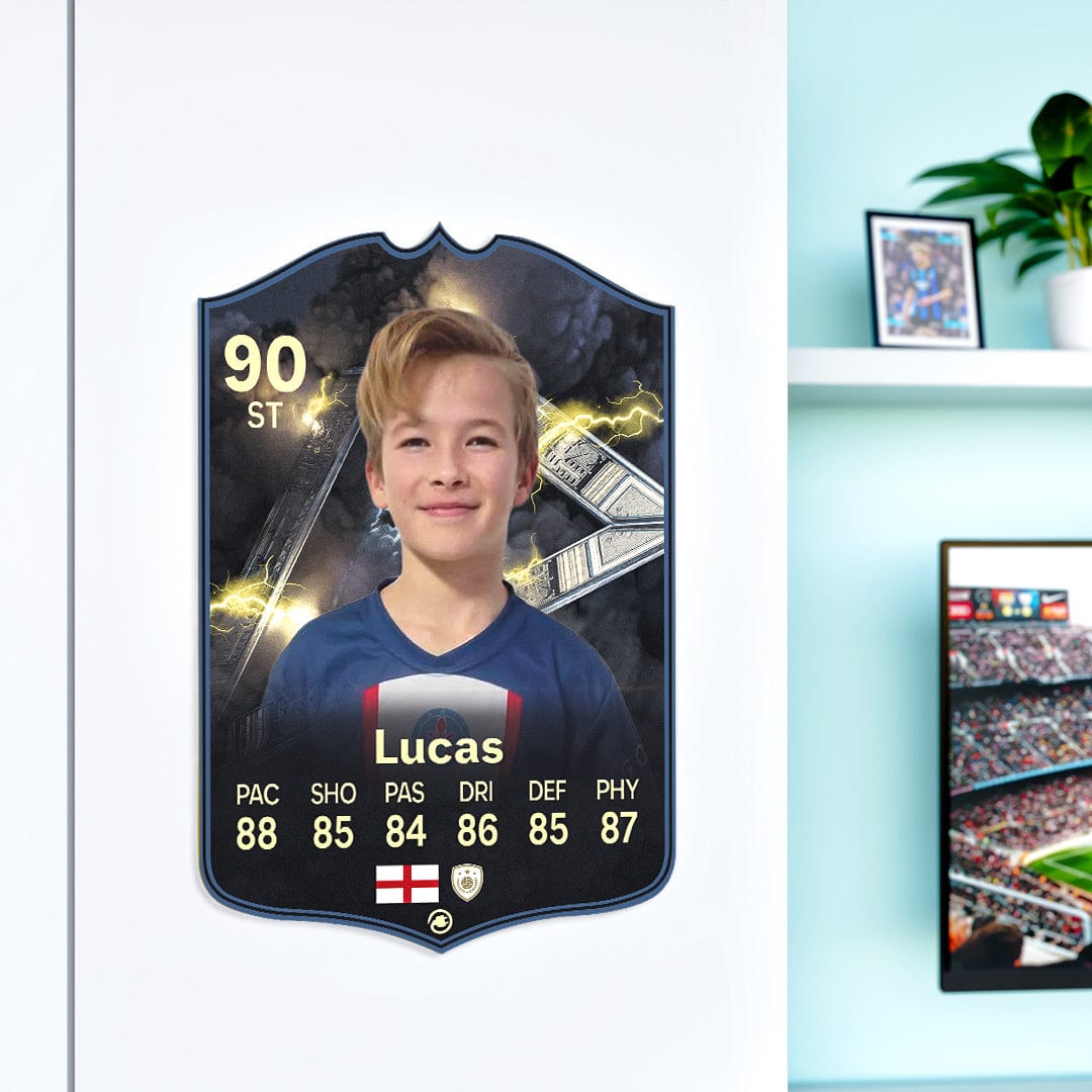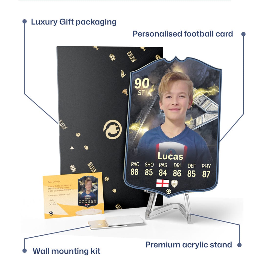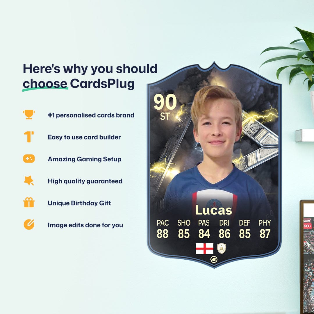 CardsPlug is home to the world’s favourite personalised football cards. Our easy football card builder lets you make a real life football card with your own name, photo, and skill ratings. With 100+ designs to choose from and some inspired by EA SPORTS FC 26 cards seen in EA FC 26, EA FC 25 and FC 24 as well as FIFA cards seen in games like FIFA 23 and FIFA 22.