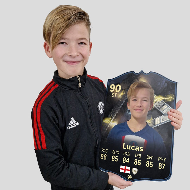 When it comes to personalising your card, the basic steps are to upload a photo and add a name to your card. Then you’ll add details like your player’s position and skill ratings out of 99 for each football skill shown on the card. Our online card builder makes this really easy. And if you aren’t a football card expert, don’t worry!