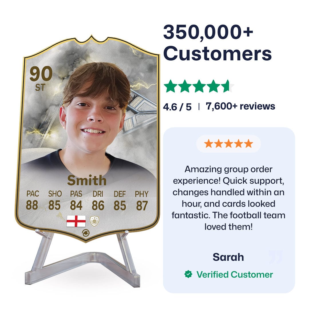 Once you’ve personalised your card, our design experts will edit your photo, design your card, and bring it to life in stunning quality. You’ll get a full preview before we print your card and every card’s quality is backed by our Gold Standard Guarantee. So far, over 350,000+ football fans agree: A CardsPlug football card is the ultimate football gift!
