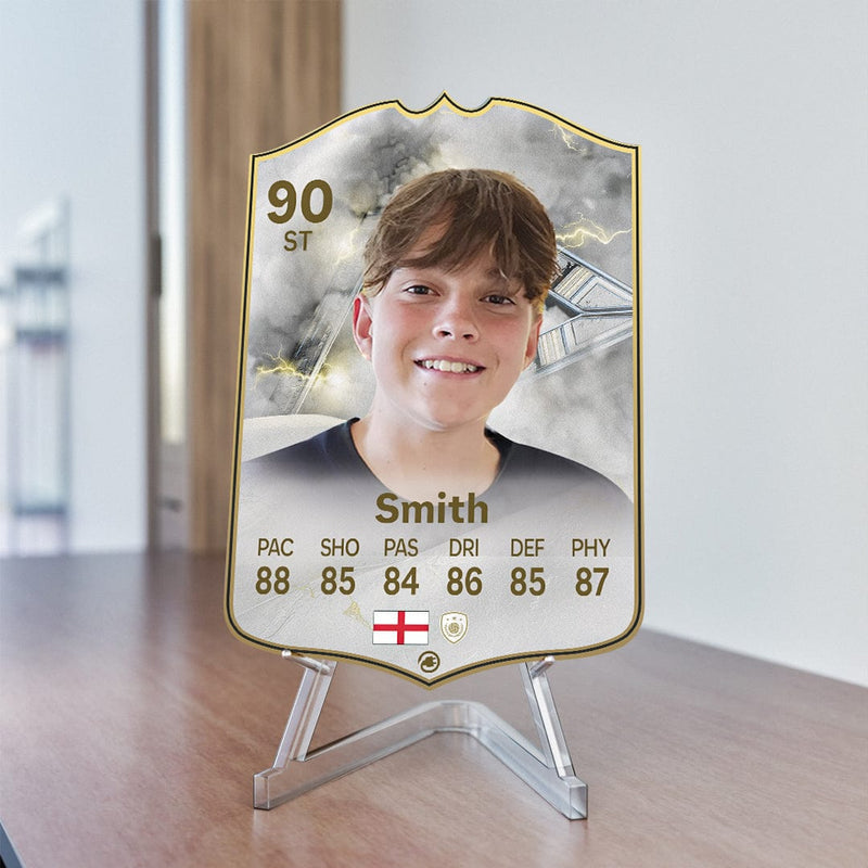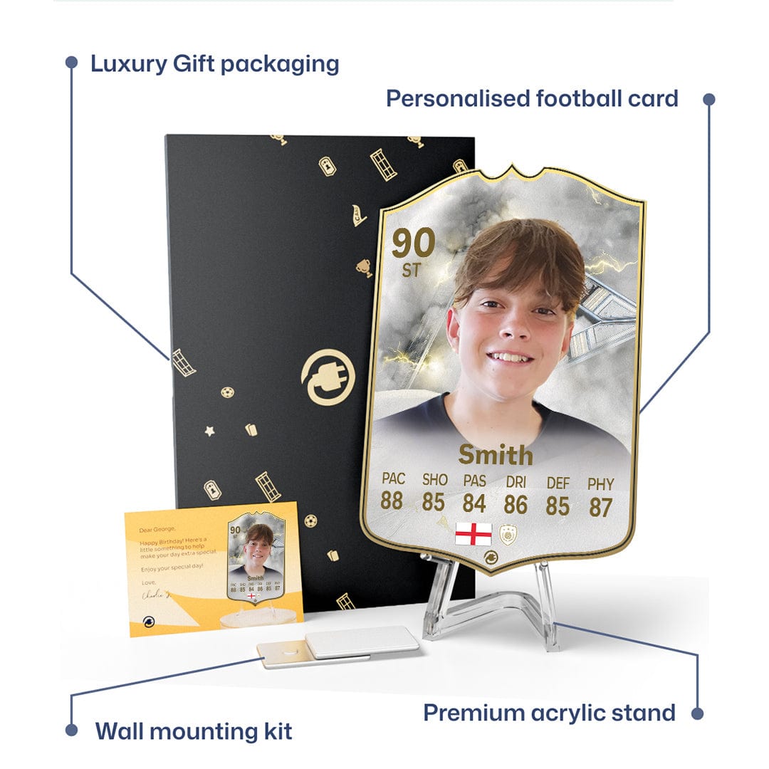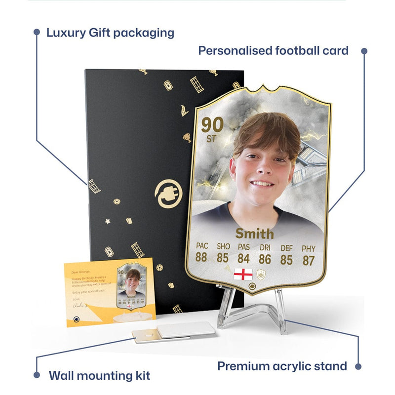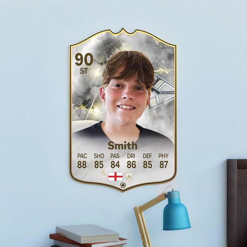 When it comes to personalising your card, the basic steps are to upload a photo and add a name to your card. Then you’ll add details like your player’s position and skill ratings out of 99 for each football skill shown on the card. Our online card builder makes this really easy. And if you aren’t a football card expert, don’t worry!