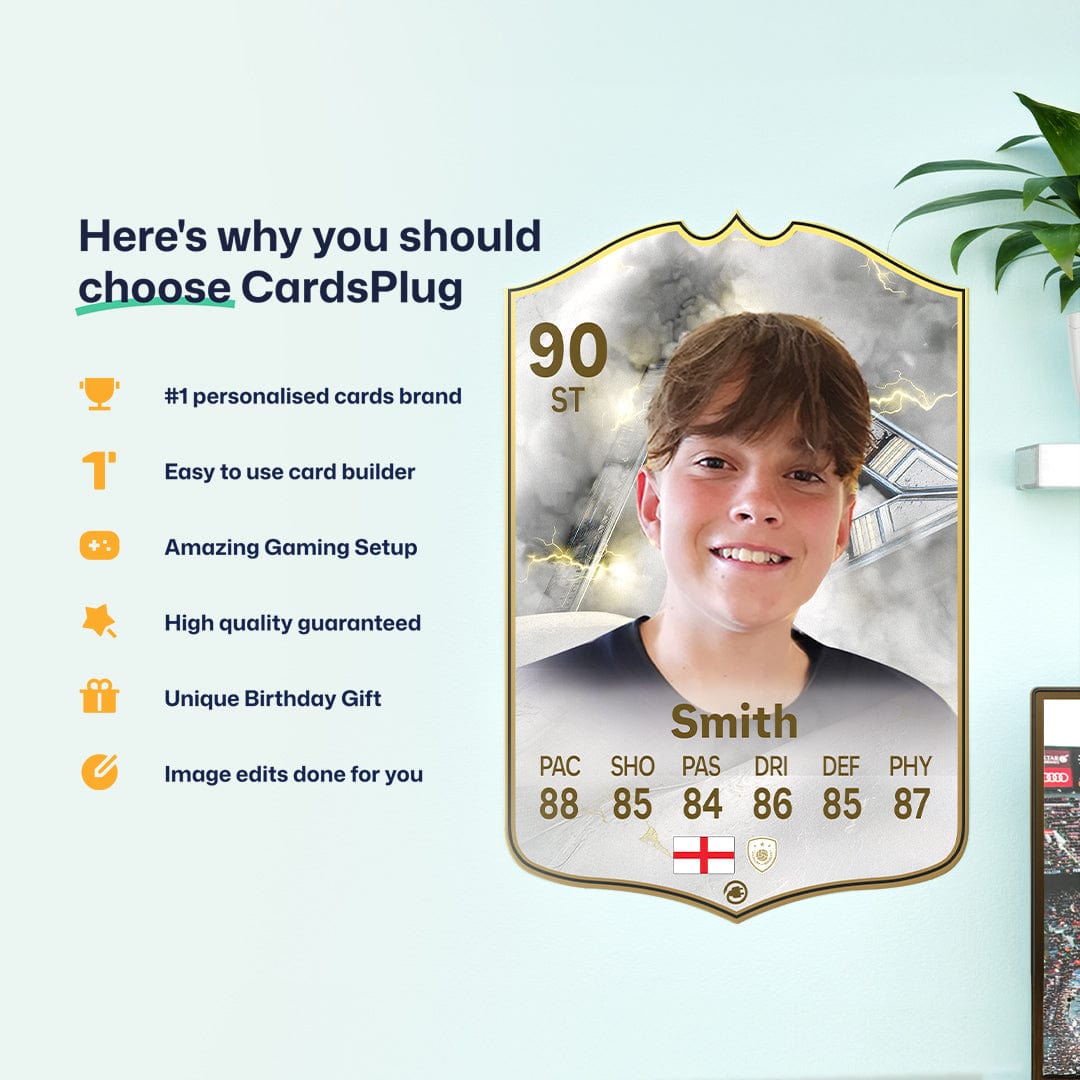CardsPlug is home to the world’s favourite personalised football cards. Our easy football card builder lets you make a real life football card with your own name, photo, and skill ratings. With 100+ designs to choose from and some inspired by EA SPORTS FC 26 cards seen in EA FC 26, EA FC 25 and FC 24 as well as FIFA cards seen in games like FIFA 23 and FIFA 22.