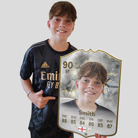 Our football card builder lets you choose between two different card materials. Our Standard cards are made of a ultra-strong variety of Foamex (not cardboard or foam!). This material has a lovely gloss finish and is also super durable. Our world-exclusive Metal football cards have a matte finish and are slightly heavier. Both look amazing and will last forever.