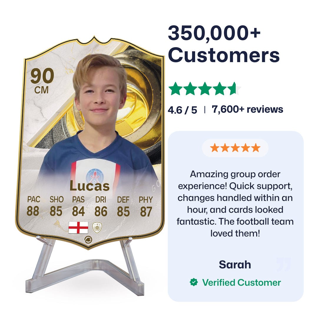 Once you’ve personalised your card, our design experts will edit your photo, design your card, and bring it to life in stunning quality. You’ll get a full preview before we print your card and every card’s quality is backed by our Gold Standard Guarantee. So far, over 350,000+ football fans agree: A CardsPlug football card is the ultimate football gift!