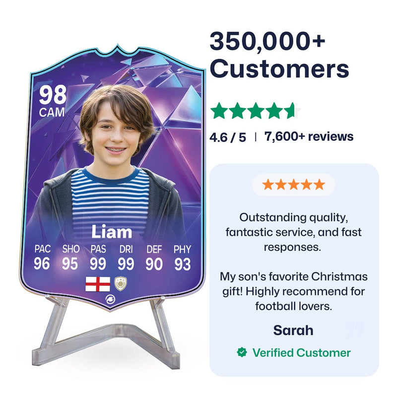 Once you’ve personalised your card, our design experts will edit your photo, design your card, and bring it to life in stunning quality. You’ll get a full preview before we print your card and every card’s quality is backed by our Gold Standard Guarantee. So far, over 350,000+ football fans agree: A CardsPlug football card is the ultimate football gift!