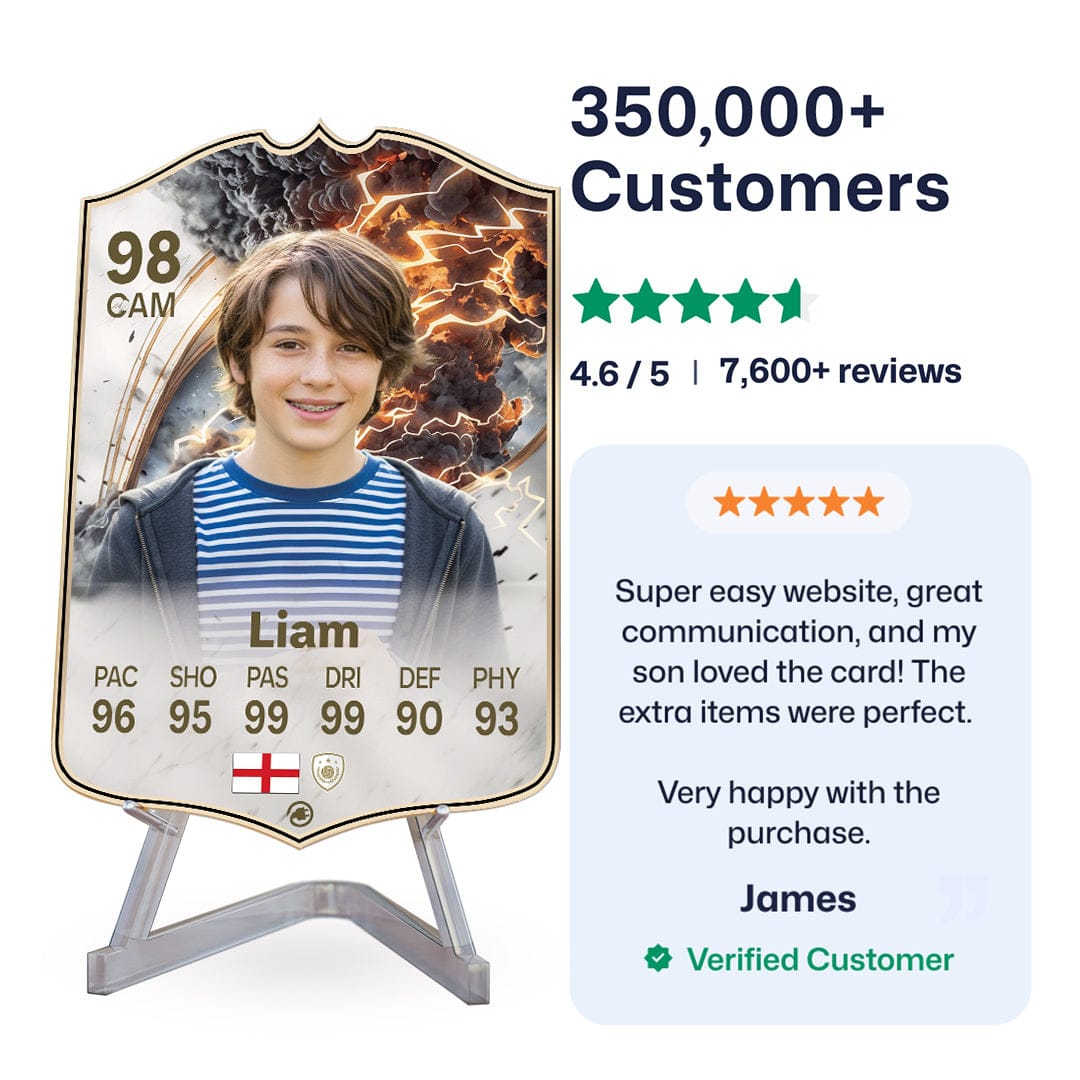 Once you’ve personalised your card, our design experts will edit your photo, design your card, and bring it to life in stunning quality. You’ll get a full preview before we print your card and every card’s quality is backed by our Gold Standard Guarantee. So far, over 350,000+ football fans agree: A CardsPlug football card is the ultimate football gift!