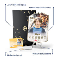 When it comes to personalising your card, the basic steps are to upload a photo and add a name to your card. Then you’ll add details like your player’s position and skill ratings out of 99 for each football skill shown on the card. Our online card builder makes this really easy. And if you aren’t a football card expert, don’t worry!