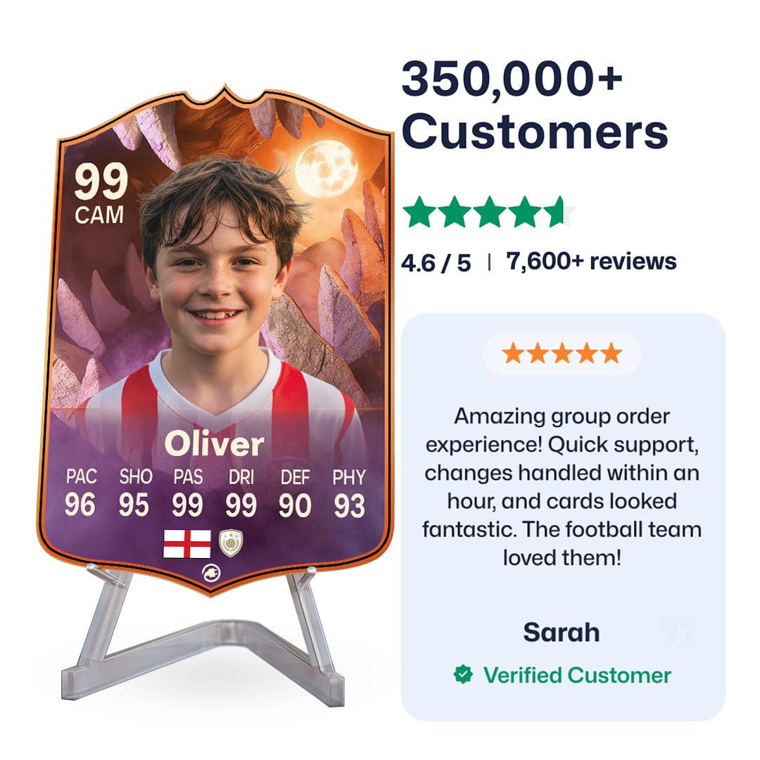 Once you’ve personalised your card, our design experts will edit your photo, design your card, and bring it to life in stunning quality. You’ll get a full preview before we print your card and every card’s quality is backed by our Gold Standard Guarantee. So far, over 350,000+ football fans agree: A CardsPlug football card is the ultimate football gift!