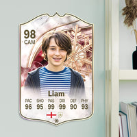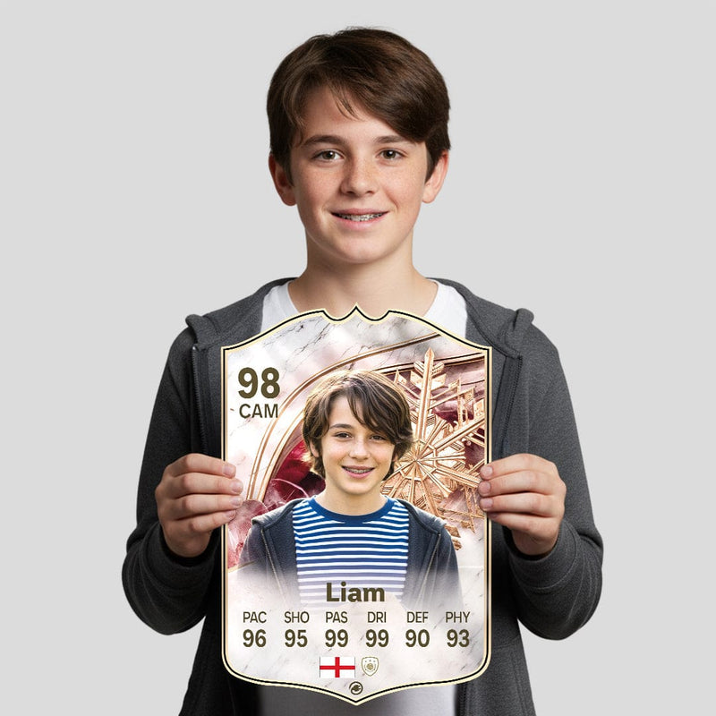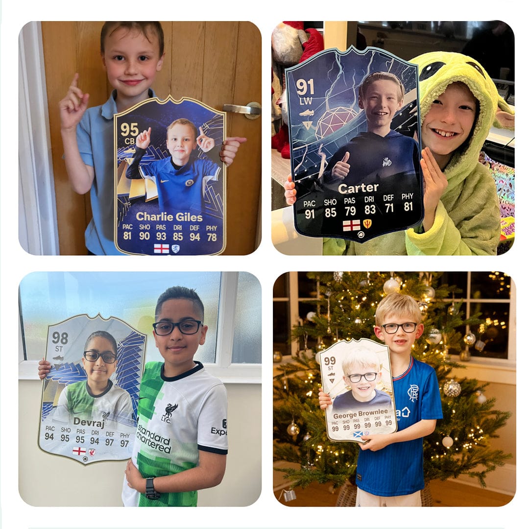 When it comes to personalising your card, the basic steps are to upload a photo and add a name to your card. Then you’ll add details like your player’s position and skill ratings out of 99 for each football skill shown on the card. Our online card builder makes this really easy. And if you aren’t a football card expert, don’t worry!