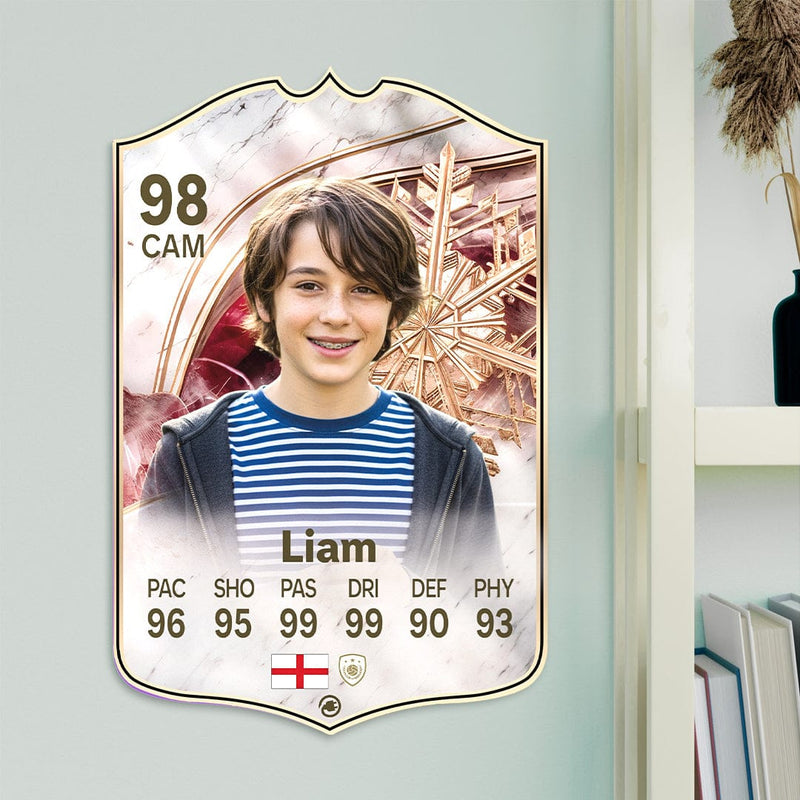 Our football card builder lets you choose between two different card materials. Our Standard cards are made of a ultra-strong variety of Foamex (not cardboard or foam!). This material has a lovely gloss finish and is also super durable. Our world-exclusive Metal football cards have a matte finish and are slightly heavier. Both look amazing and will last forever.